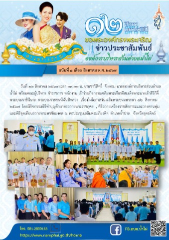 วันที่ 12 สิงหาคม 2567 เวลา 07.00 น. นายชาวิสิทธิ์ ขิงหอม นายกองค์การบริหารส่วนตำบลน้ำไผ่ พร้อมคณะผู้บริหาร ข้าราชการ พนักงาน เข้าร่วมกิจกรรมเฉลิมพระเกียรติสมเด็จพระนางเจ้าสิริกิติ์ พระบรมราชินีนาถ พระบรมราชชนนีพันปีหลวง เนื่องในโอกาสวันเฉลิมพระชนมพรรษา 12 สิงหาคม 2567 โดยมีกิจกรรมพิธีทำบุญตักบาตรถวายพระราชกุศล , พิธีถวายเครื่องราชสักการะและวางพานพุ่ม และพิธีจุดเทียนถวายพระพรชัยมงคล ณ หอประชุมเฉลิมพระเกียรติฯ อำเภอน้ำปาด จังหวัดอุตรดิตถ์