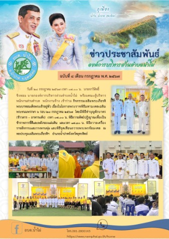 วันที่ 28 กรกฎาคม 2567 เวลา 07.00 น. นายชาวิสิทธิ์ ขิงหอม นายกองค์การบริหารส่วนตำบลน้ำไผ่ พร้อมคณะผู้บริหาร พนักงานส่วนตำบล พนักงานจ้าง เข้าร่วม กิจกรรมเฉลิมพระเกียรติพระบาทสมเด็จพระเจ้าอยู่หัว เนื่องในโอกาสพระราชพิธีมหามงคลเฉลิมพระชนมพรรษา 6 รอบ 28 กรกฎาคม 2567 โดยมีพิธีทำบุญตักบาตร (ข้าวสาร - อาหารแห้ง) เวลา 07.00 น. พิธีถวายสัตย์ปฏิญาณเพื่อเป็นข้าราชการที่ดีและพลังของแผ่นดิน และเวลา 17.30 น. พิธีถวายเครื่องราชสักการะและวางพานพุ่ม และพิธีจุดเทียนถวายพระพรชัยมงคล ณ หอประชุมเฉลิมพระเกียรติฯ อำเภอน้ำปาดจังหวัดอุตรดิตถ์