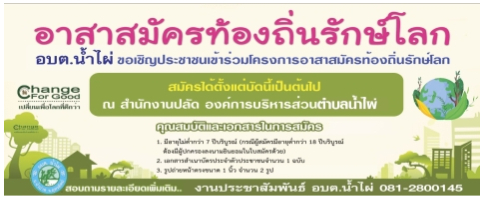 อาสาสมัครท้องถิ่นรักษ์โลก (อถล.) คือ บุคคลที่มีความสนใจ มีความสมัครใจมีความเสียสละและอุทิศตนในการทำงานด้านการจัดการสิ่งปฏิกูลและมูลฝอย การปกป้องและรักษาสิ่งแวดล้อมในท้องถิ่นของตนเอง ใช้ชื่อย่อว่า อถล. ซึ่งบุคคลที่จะสมัครเป็น อถล. ได้จะต้องมีคุณสมบัติ ดังต่อไปนี้ 1. มีสัญชาติไทย 2. มีอายุไม่ต่ำกว่า 7 ปี บริบูรณ์ 3. มีภูมิลำเนาอยู่ในเขตตำบลน้ำไผ่ ความหมายและสัญลักษณ์ของ อถล. อถล. เป็นการรวมกลุ่มของประชาชนในท้องถิ่นที่มีจิตอาสาในการช่วยเหลืองานขององค์กรปกครองส่วนท้องถิ่น เกี่ยวกับการจัดการสิ่งปฏิกูลและมูลฝอย การปกป้องและรักษาทรัพยากรธรรมชาติและสิ่งแวดล้อม "อาสาสมัครท้องถิ่นรักษ์โลก" หมายความว่า ประชาชนที่มีจิตอาสา สมัครใจ เสียสละ และอุทิศตน เพื่อช่วยเหลืองานด้านการจัดการสิ่งปฏิกูลและมูลฝอย การปกป้อง และรักษาทรัพยากรธรรมชาติ และสิ่งแวดล้อมขององค์กรปกครองส่วนท้องถิ่น ใช้ชื่อย่อว่า "อถล." มีชื่อเรียกภาษาอังกฤษว่า "Local Environment Volunteer" และใช้ชื่อย่อภาษาอังกฤษว่า "LEV" "เครือข่ายอาสาสมัครท้องถิ่นรักษ์โลก" หมายความว่า การเชื่อมโยงกันของ อถล. เพื่อการเรียนรู้แลกเปลี่ยนข่าวสาร หรือทํากิจกรรมร่วมกัน ในการบริหารจัดการสิ่งปฏิกูลและมูลฝอย รักษาสิ่งแวดล้อมและทรัพยากรธรรมชาติด้วยความเป็นอิสระและเท่าเทียมกันของบุคคล ภายใต้พื้นฐานการเคารพสิทธิและเอื้ออาทรซึ่งกันและกัน และใช้หลักธรรมาภิบาลในการทํางานร่วมกัน โดยใช้ชื่อย่อว่า "เครือข่าย อถล."