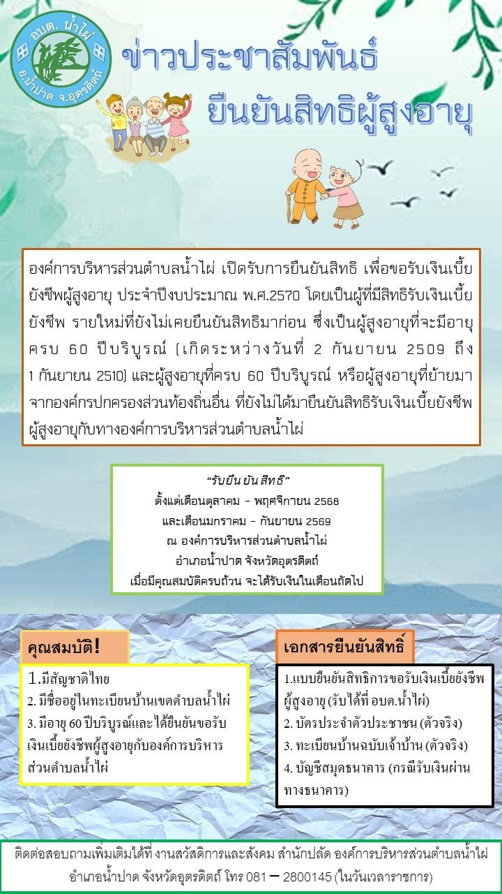 ประชาสัมพันธ์ ผู้สูงอายุให้ยืนยันสิทธิ์รับเบี้ยยังชีพผู้สูงอายุ ประจำปีงบประมาณ พ.ศ. 2570 ผู้ที่เกิดระหว่างวันที่ 2 กันยายน 2509 - 1 กันยายน 2510