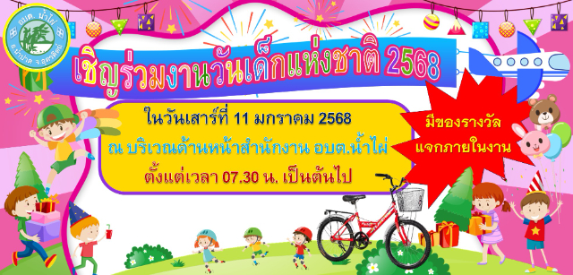 น้อง ๆ หนูๆ เตรียมตัวให้พร้อม! แล้วมาสนุกด้วยกันในงานวันเด็กแห่งชาติ องค์การบริหารส่วนตำบลน้ำไผ่ ประจำปี 2568